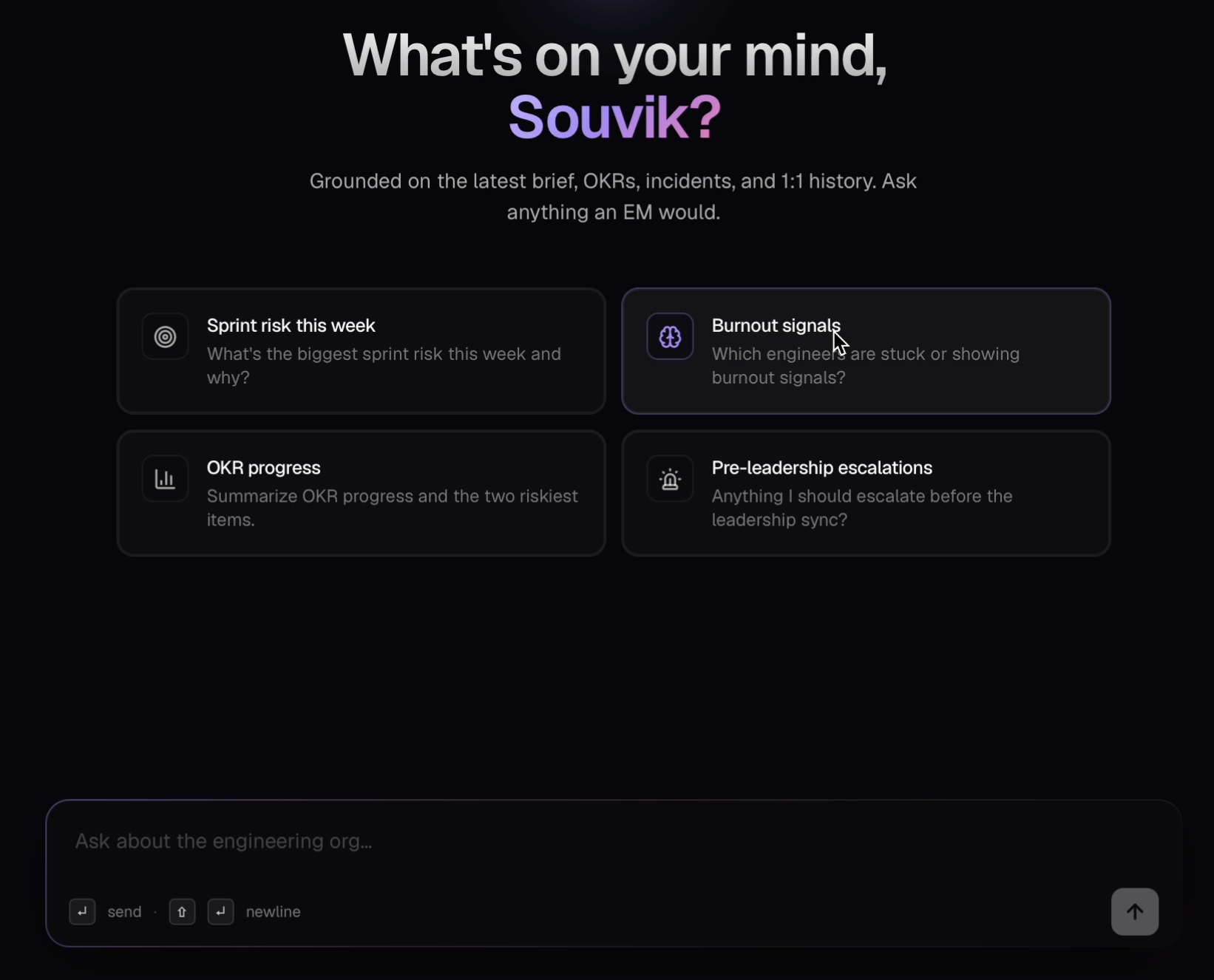 Grounded on the latest brief, OKRs, incidents, and 1:1 history. Get instant answers to questions like sprint risks, burnout signals, or pre-leadership escalations.